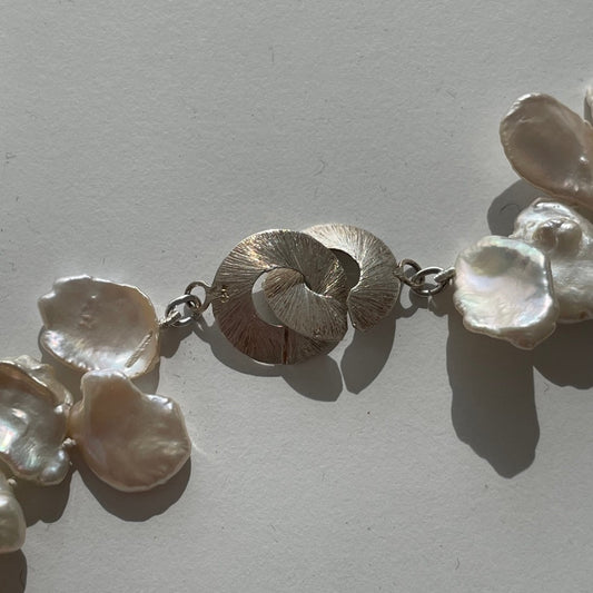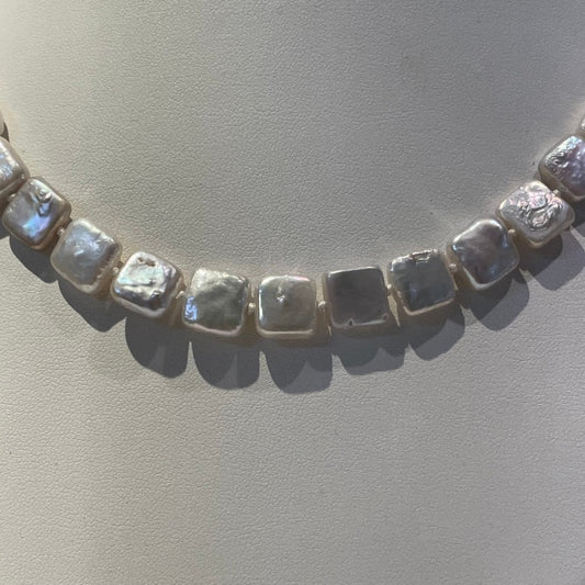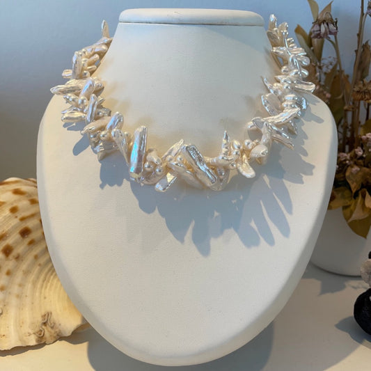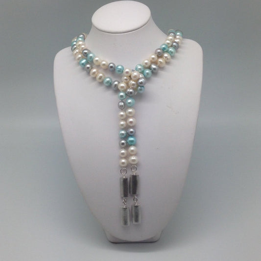 Collier met witte, grijze en blauwe zoetwaterparels te dragen als sjaal